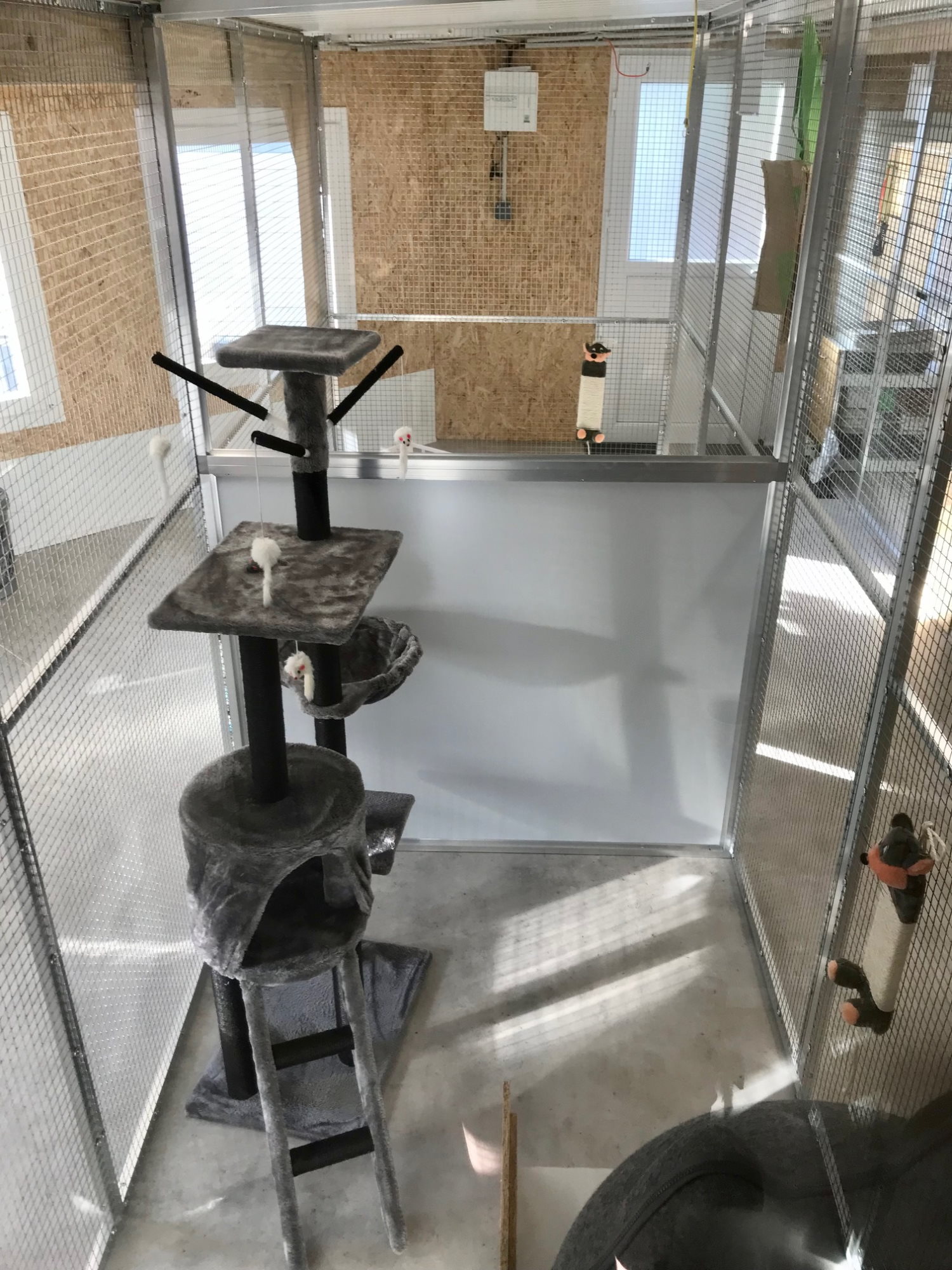 Indépendante des bâtiments des chiens, la chatterie est au calme, chauffée en hiver, climatisée en été et dotée de plusieurs fenêtres pour pouvoir observer le monde extérieur. Afin d’atténuer le stress, nous pulvérisons sur nos tissus un produit naturel vétérinaire, à base d’huiles essentielles apaisantes.